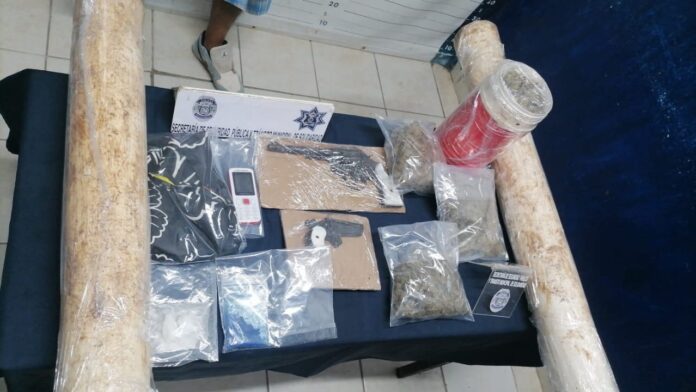 Playa del Carmen, Solidaridad a 23 de diciembre de 2023.- Policías Municipales de Solidaridad aseguraron a 2 sujetos en distintos hechos, dos armas de fuego y posibles narcóticos como resultado de la respuesta inmediata durante las acciones de vigilancia permanente en las colonias.