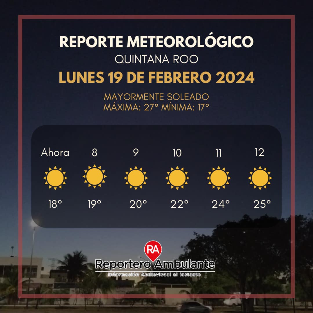 Sistema de alta presión localizado sobre el noroeste del Golfo de México, mantendrá el flujo de aire ártico modificado sobre la región peninsular y el Estado de Quintana Roo, cielo parcialmente nublado con baja probabilidad de lluvias. Las temperaturas serán templadas durante el día y frescas a frías por la noche y al amanecer. Así mismo mantendrá el evento de “Norte” sobre las zonas de costa del estado con vientos del norte y noroeste de 40 a 50 km/h.
