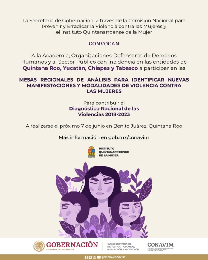 Convocan a participar en las Mesas Regionales de Análisis para Identificar Nuevas Manifestaciones y Modalidades de Violencia Contra las Mujeres. La Secretaría de Gobernación, a través de la Comisión Nacional para Prevenir y Erradicar la Violencia contra las Mujeres y el Instituto Quintanarroense de la Mujer