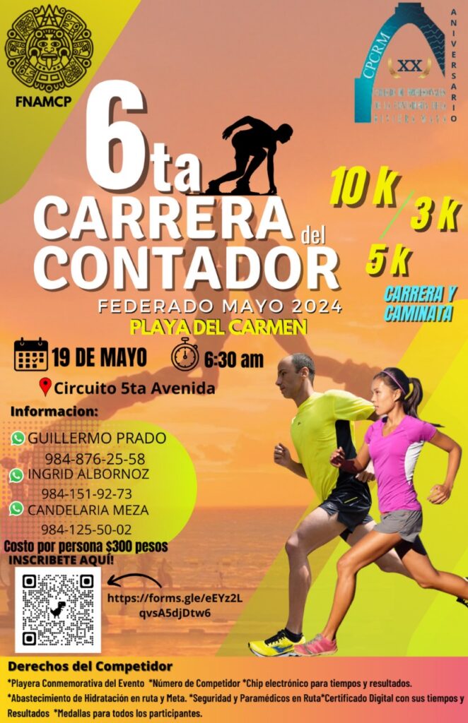 Pedro López Acosta, presidente de la organización, informó que las actividades deportivas comenzarán a partir del domingo 19 de mayo con la carrera Infantil de 400 metros a partir de las 7:00 de la mañana desde el parque Fundadores de Playa del Carmen y que la 6ª Carrera Nacional de Contadores tendrá categorías de 3, 5 y 10 kilómetros para Adultos.
