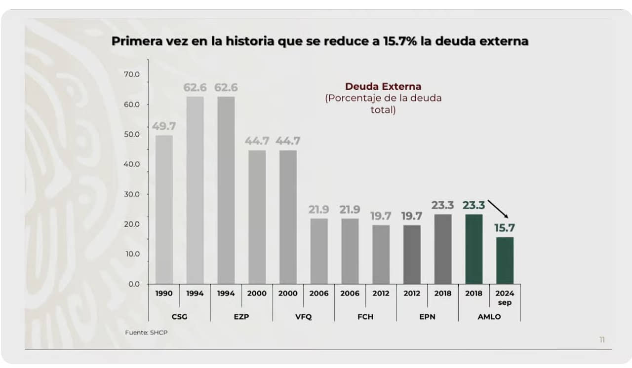 En todo el sexenio, el presidente López Obrador redujo la deuda pública de 50.2% con relación al PIB en 2020 a 48.6% en 2024, y desde el principio del sexenio, se aumentó sólo 4.9%, al pasar de 43.2% a 48.6%, lo que es menos que los ocho puntos porcentuales que creció en el sexenio Enrique Peña Nieto y los 7.4 puntos en el sexenio de Felipe Calderón.