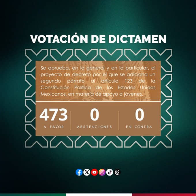 México, 26 de septiembre de 2024.- Aprueban Diputados elevar a rango constitucional el programa “Jóvenes construyendo el futuro”. Por unanimidad con 473 votos a favor la Cámara de Diputados aprobó en lo general y en lo particular la reforma al artículo 123, que eleva a rango constitucional el programa “Jóvenes construyendo el futuro”, tras su aprobación la minuta es enviada al senado para su discusión y eventual aprobación.