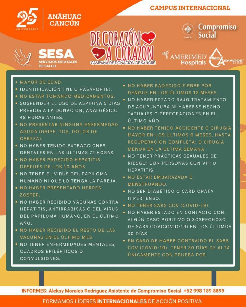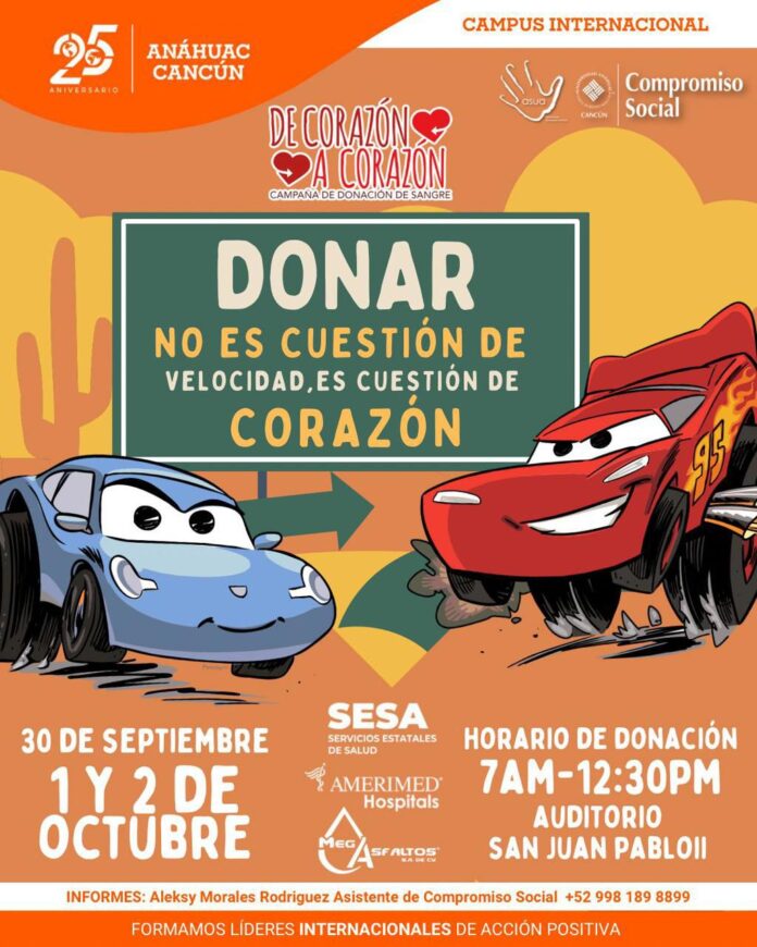Cancún.— Con el lema “Donar sangre es donar vida”, la Universidad Anáhuac Cancún lleva a cabo la campaña de donación de sangre “De corazón a corazón”, del 30 de septiembre al 2 de octubre en el auditorio San Juan Pablo II, en un horario de 7:00 de la mañana a 12:30 del día, anunció la gobernadora Mara Lezama Espinosa.