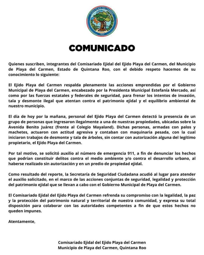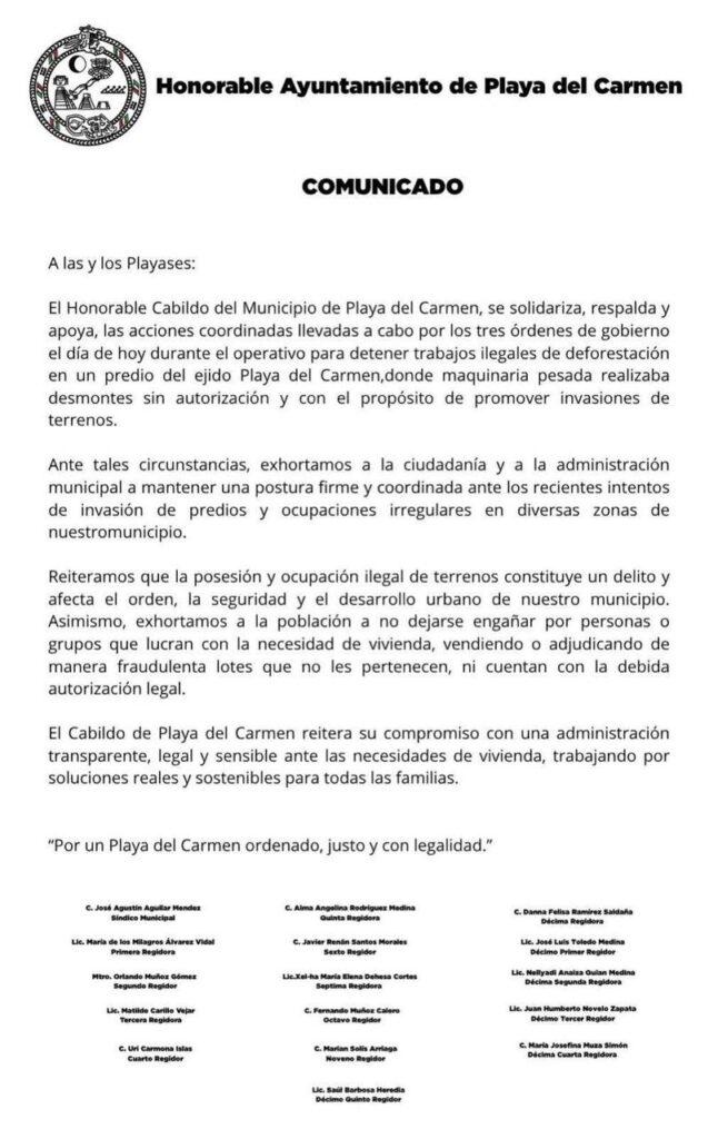 El Gobierno de Playa del Carmen confirmó en un comunicado que el operativo fue realizado en coordinación con la Secretaría de Seguridad Ciudadana del Estado, con el objetivo de detener trabajos ilegales de deforestación detectados en un predio del ejido Playa del Carmen, donde presuntamente se realizaban desmontes con maquinaria pesada “para promover invasiones de terrenos”.