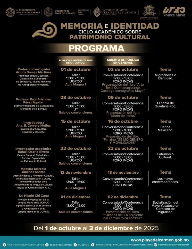 Además, los días 22 y 23 de octubre se llevará a cabo el taller y conversatorio con el investigador académico Rafael Osorio, en la Sala Magna de la UQROO y en el Foro Cultural.
