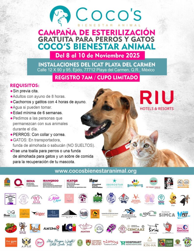 Asimismo, subrayó que la Campaña de Esterilización Gratuita de Coco’s Bienestar Animal, que se llevará a cabo del 8 al 10 de noviembre en el ICAT Playa del Carmen, tiene como objetivo fortalecer la salud pública y el bienestar animal desde una práctica profesional, ética y transparente.