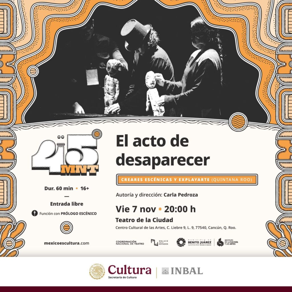 Esta participación representa un hito para la comunidad artística playense, ya que “El acto de desaparecer” coloca por primera vez a Playa del Carmen y Quintana Roo en la Muestra Nacional de Teatro, evento organizado por el INBAL que reúne a las producciones más destacadas del país.
