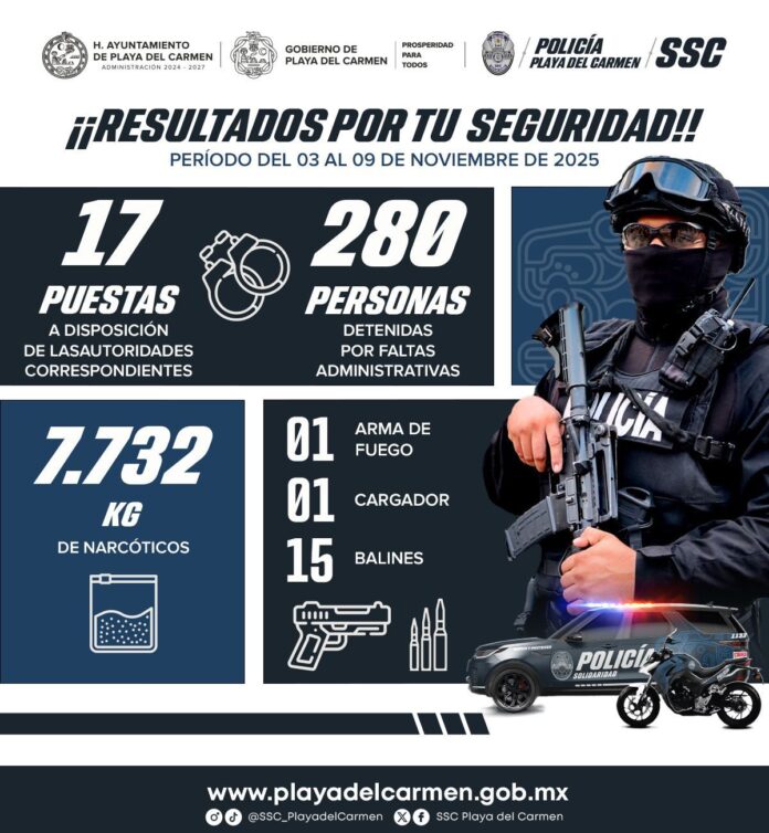 Playa del Carmen, Quintana Roo, 12 de noviembre de 2025. — La tranquilidad de las familias playenses se fortalece con nuevas acciones de vigilancia y prevención que lograron la detención de 280 personas por faltas administrativas y el aseguramiento de más de siete kilogramos de drogas, además de un arma de fuego y un cargador.