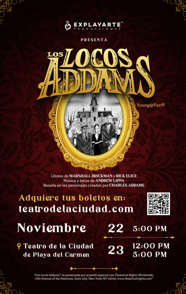 Playa del Carmen, Q. Roo — La reconocida institución artística Explayarte Producciones celebra más de 15 años de trayectoria en el teatro musical con la puesta en escena de “Los Locos Addams”, un musical basado en los entrañables personajes creados por Charles Addams. Las funciones se realizarán los días 22 de noviembre a las 5:00 p.m. y 23 de noviembre a las 12:00 p.m. y 5:00 p.m., en el Teatro de la Ciudad de Playa del Carmen.