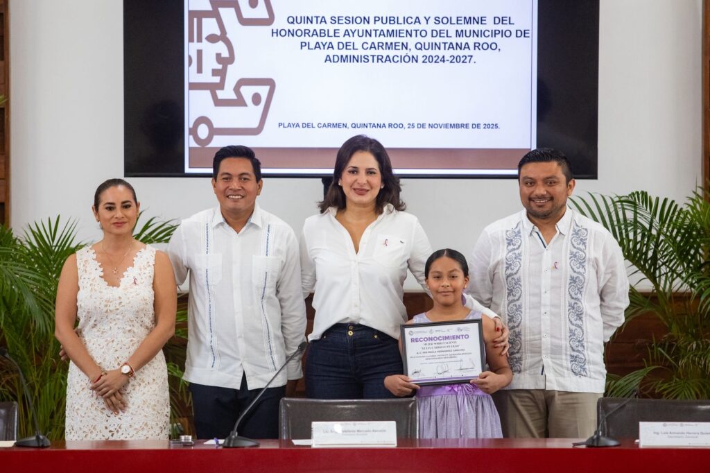 Playa del Carmen, Quintana Roo, 25 de noviembre de 2025.— En el marco del “Día Internacional para la Eliminación de la Violencia contra las Mujeres”, la presidenta municipal Estefanía Mercado encabezó la Quinta Sesión Solemne de Cabildo, con motivo de la Entrega del Premio a la Mujer Sobresaliente “Elvia Carrillo Puerto” 2025, un reconocimiento a la trayectoria y aportaciones de mujeres playenses en distintos ámbitos sociales, culturales y comunitarios.