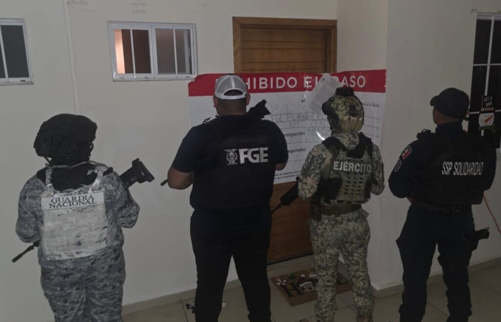 Playa del Carmen.- Durante el cumplimiento de cuatro órdenes de cateo giradas por jueces de control, agentes de la Fiscalía General del Estado, en coordinación con elementos de la Secretaría de la Defensa Nacional, Guardia Nacional, Secretaría de Marina, policías estatales y municipales, aseguraron sustancias similares a drogas y un vehículo.