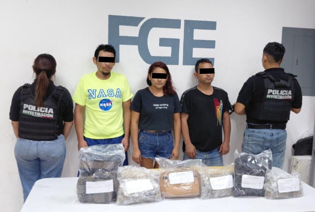 En las inmediaciones del lugar cateado, las autoridades detuvieron en flagrancia a Roberto Carlos “N”, América Yamil “N” y Margarito Enrique “N”, a quienes les aseguraron presuntos estupefacientes.