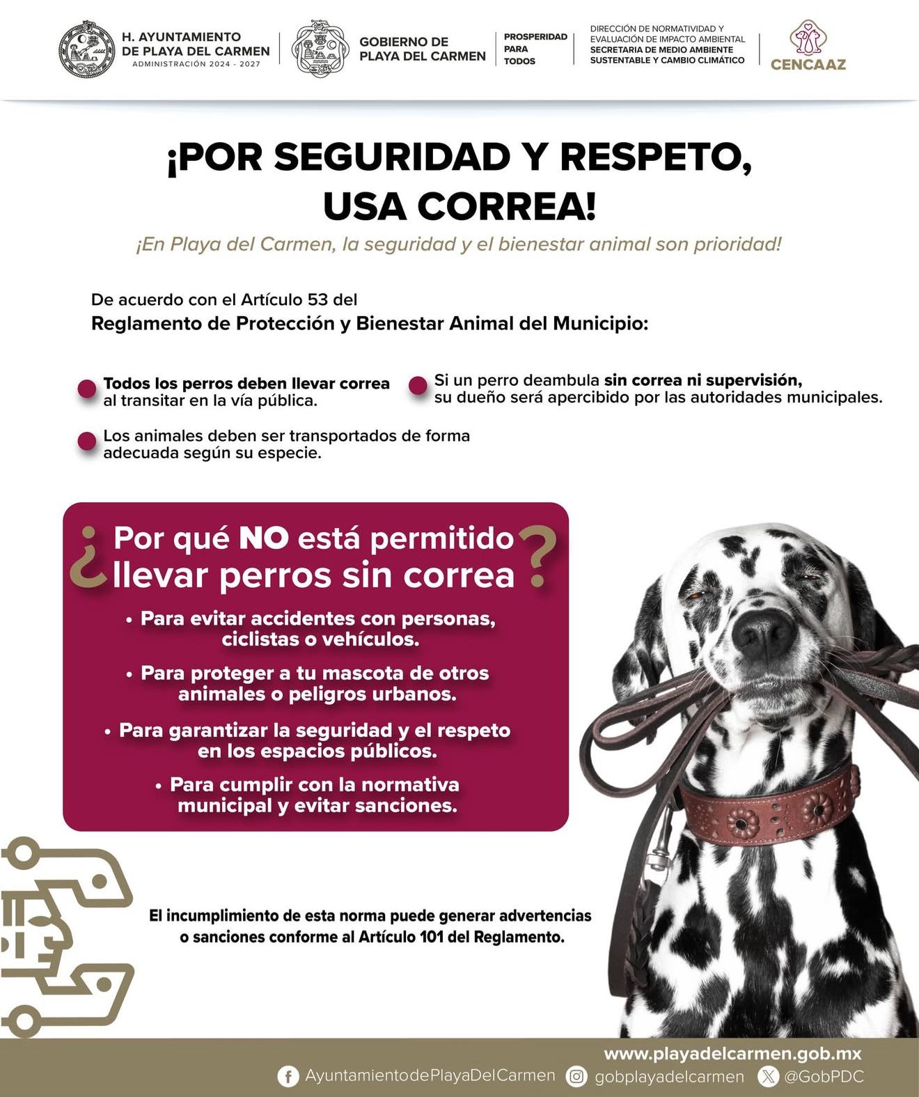 La Secretaría de Medio Ambiente Sustentable y Cambio Climático, en coordinación con la Zona Federal Marítimo Terrestre (Zofemat) de Playa del Carmen, recordó a la ciudadanía la obligatoriedad del uso de correa para perros en la vía pública, como una medida de seguridad, respeto y bienestar animal.