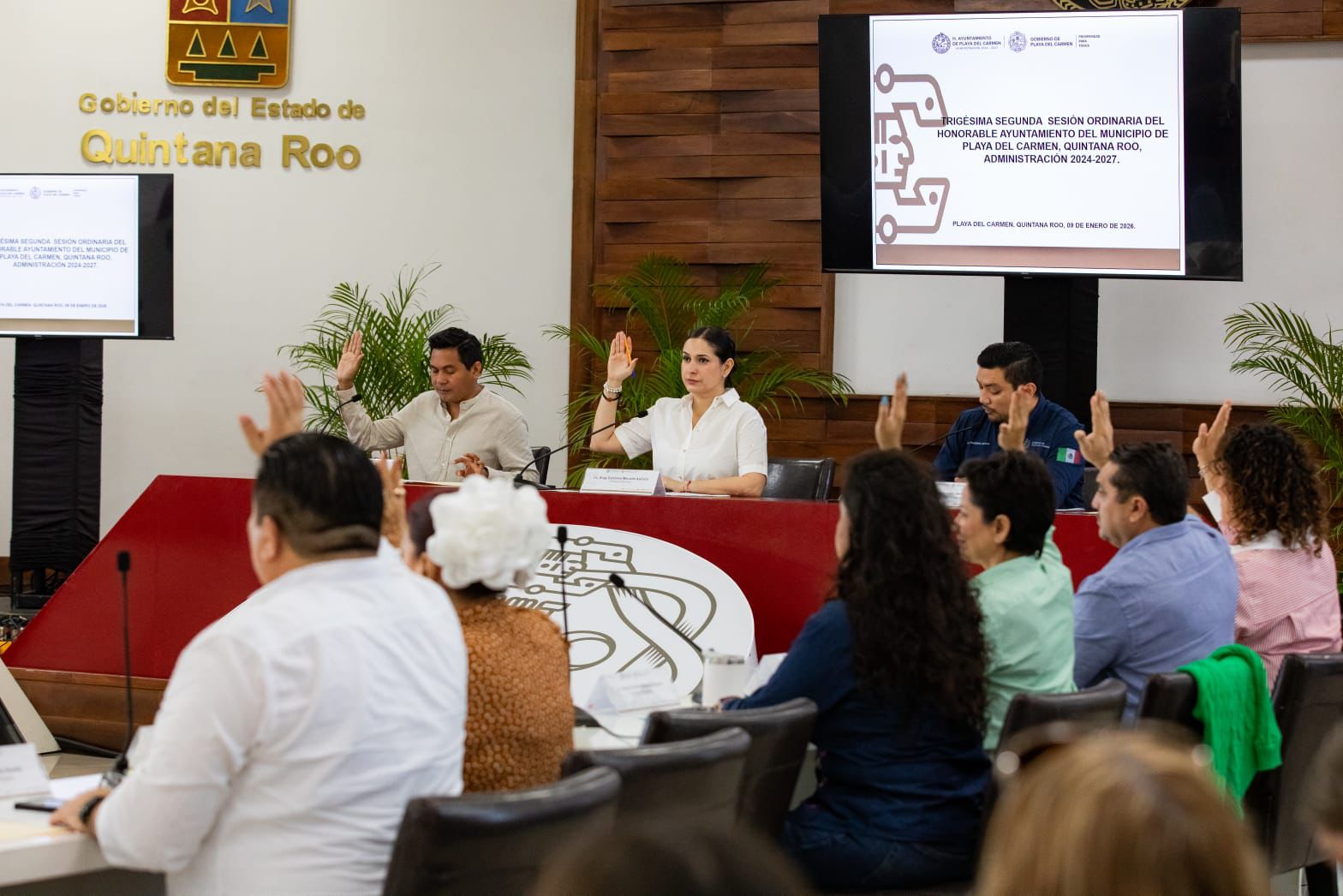 Playa del Carmen, Quintana Roo, 9 de enero de 2026.— La presidenta municipal Estefanía Mercado encabezó la Trigésima Segunda Sesión Ordinaria de Cabildo, en la que fueron aprobadas reformas al párrafo tercero del artículo 10 de la Constitución Política del Estado de Quintana Roo, enviada por la XVIII Legislatura del Congreso del Estado para su validación por los ayuntamientos.