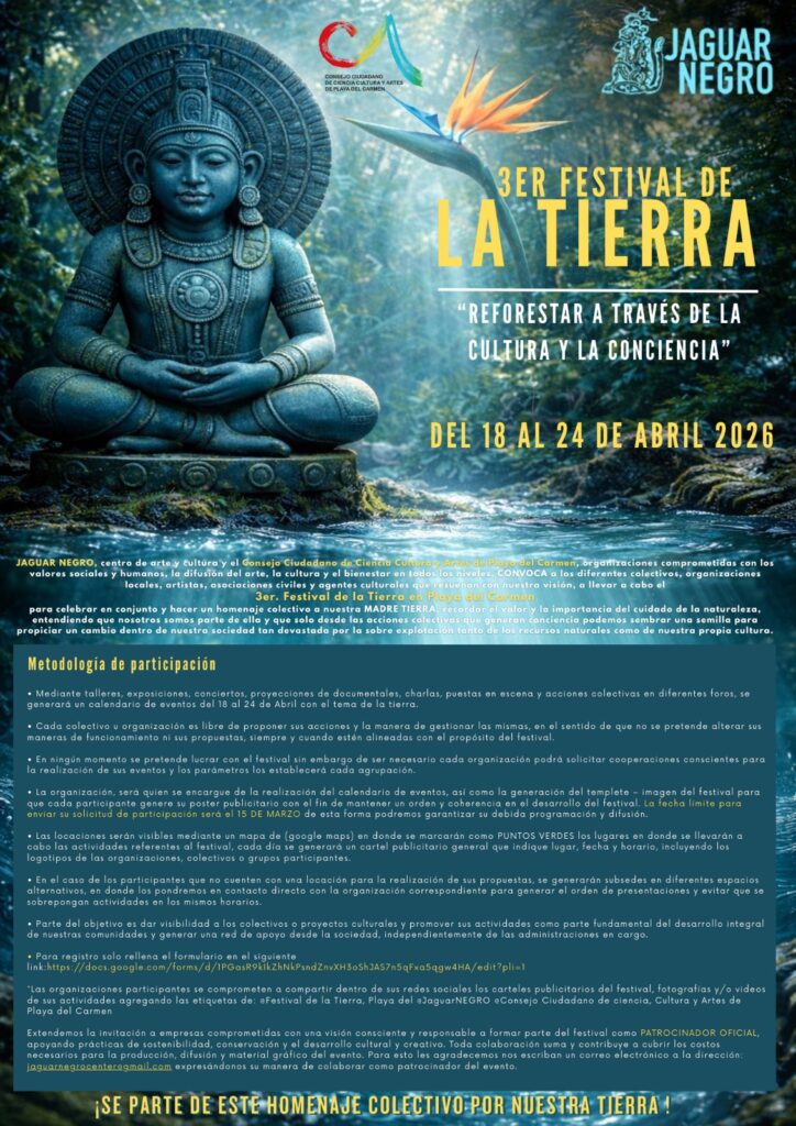 La iniciativa es impulsada por Jaguar Negro Centro de Arte y Cultura, en coordinación con el Consejo Ciudadano de Ciencia, Cultura y Artes de Playa del Carmen, e invita a colectivos, artistas, organizaciones, activistas y agentes culturales a formar parte de una semana dedicada a la reflexión, la creación y la acción en favor del territorio.