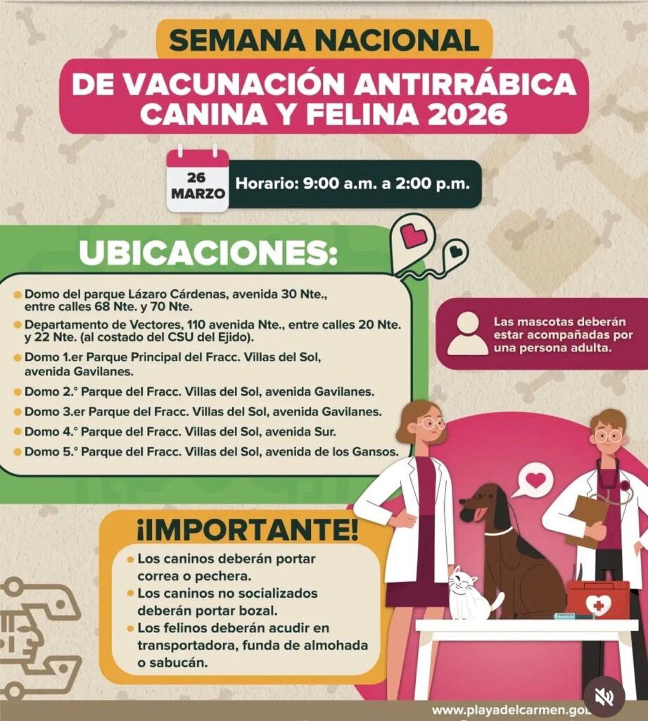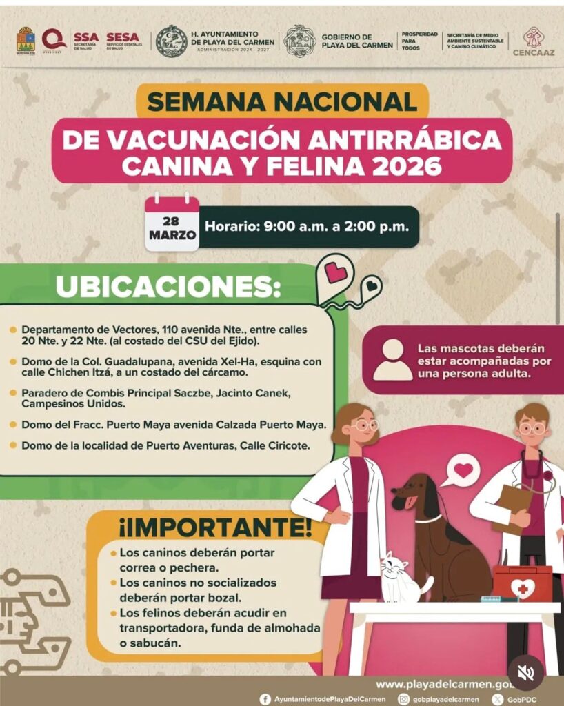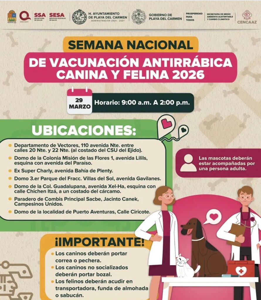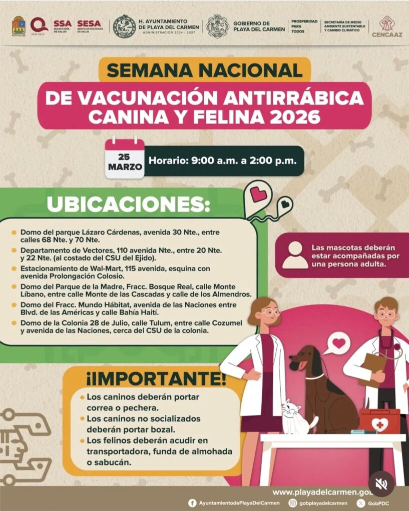 Playa del Carmen, Quintana Roo, 24 de marzo de 2026. — La Jornada Nacional de Vacunación Antirrábica registra una alta participación en Playa del Carmen, donde cientos de ciudadanos han acudido a los módulos instalados en distintos puntos de la ciudad para proteger a sus mascotas.