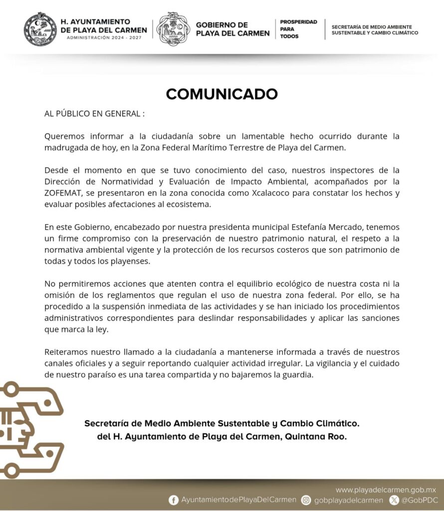 PLAYA DEL CARMEN, QUINTANA ROO.– Autoridades municipales iniciaron una investigación por un posible ecocidio en la zona de Xcalacoco, dentro de la Zona Federal Marítimo Terrestre de Playa del Carmen, tras una denuncia ciudadana que alertó sobre presuntas afectaciones al ecosistema costero.